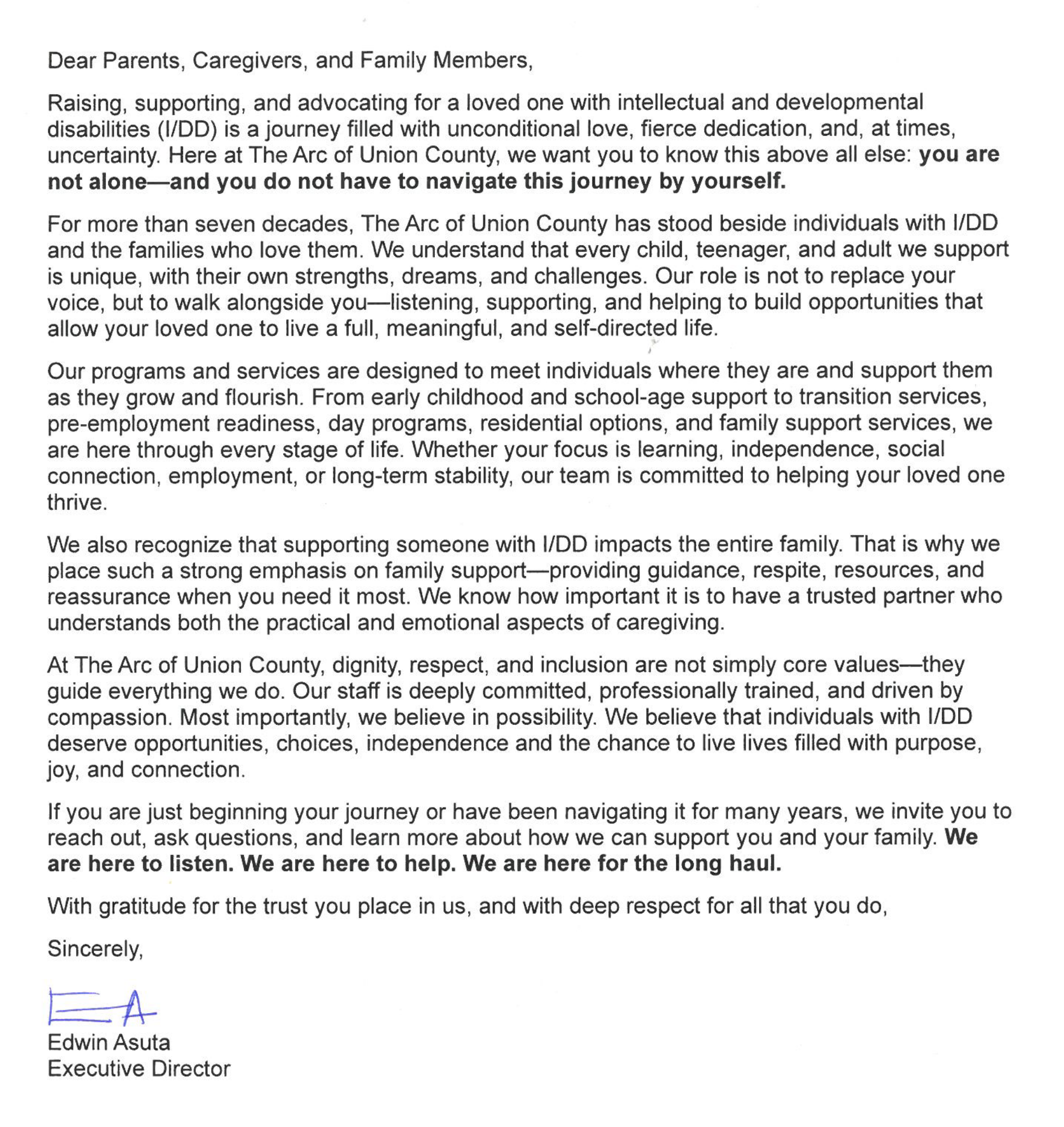 The mission of The Arc of Union County is to empower and support people with intellectual and developmental disabilities and their families. We will engage the individuals we serve, their families, public, and private entities to ensure that all people with intellectual and developmental disabilities associated with this organization realize a full, productive, and enhanced life.